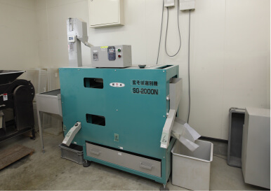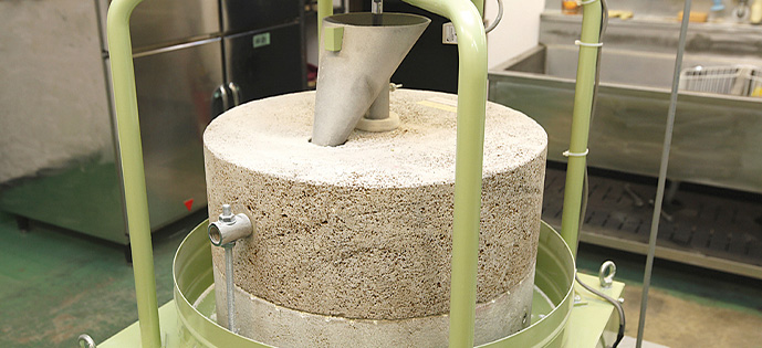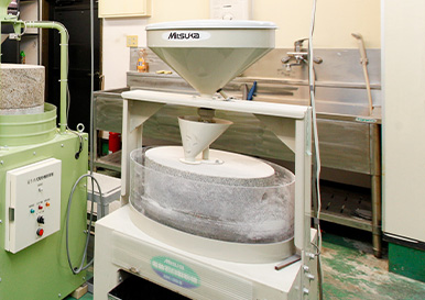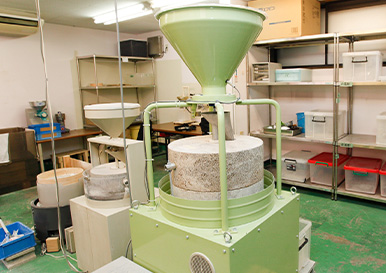 最新の設備を使い、製粉の工程で最も時間をかけて丁寧に行います。石臼挽きは熱の発生を抑えるため、玄蕎麦の風味を生かすことができます。富山県産そば粉100%のみを使用し、自家製麺しています。